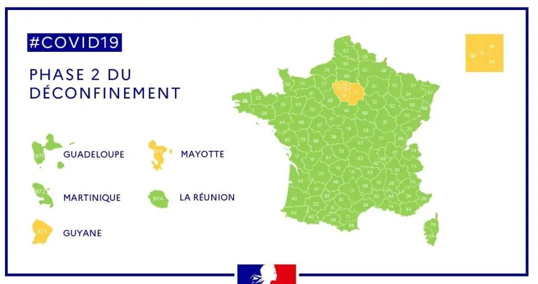 法国总理菲利普28日对外公布了“解封”第二阶段的实施计划。从6月2日起,法国全境除大巴黎地区、海外省马约特和法属圭亚那以外,所有其它省份限制措施得以进一步解除。中小学将逐步实现全面复课,餐馆、酒吧、咖啡厅等营业场所恢复营业。