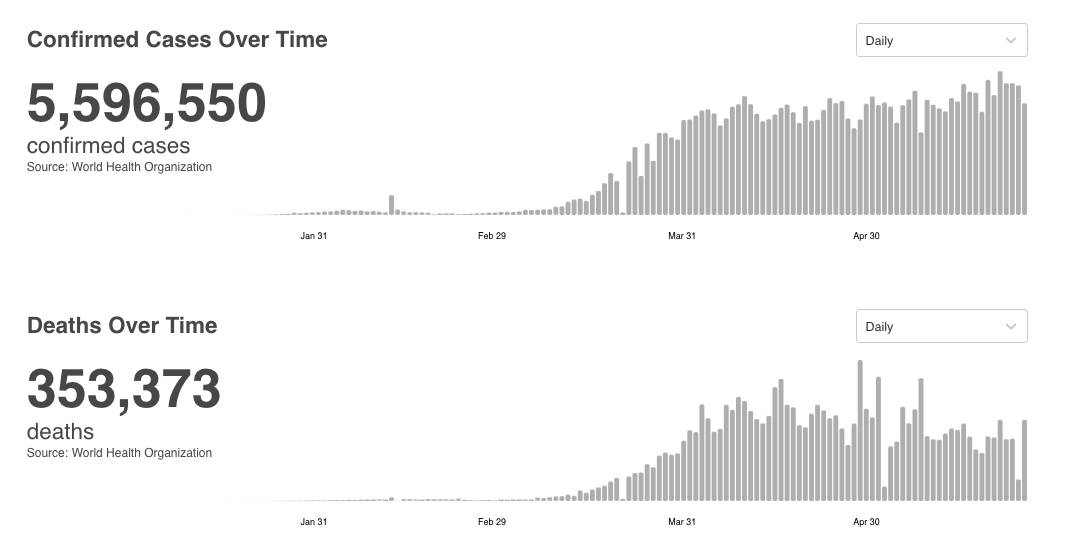 根据世卫组织最新实时统计数据,全球累计新冠肺炎确诊病例超559万例,死亡病例超35万例。根据世卫组织每日情况报告,全球单日新增新冠肺炎确诊病例104505例。