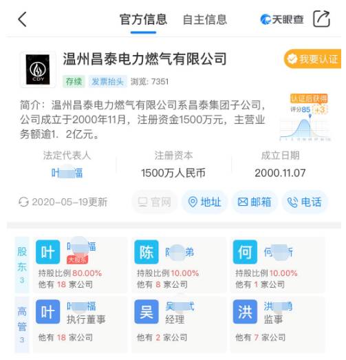 天眼查显示,瑞安市瑞阳危险品运输有限公司(下称“瑞阳公司”)成立于2003年,注册资本59.5万元,经营范围包括危品货运(凭许可证经营),汽车信息咨询服务,代办汽车上牌、年审手续服务,汽车租赁服务;温州昌泰电力燃气有限公司(下称“昌泰公司”)则成立于2000年,注册资本1500万元,经营范围包括瓶装燃气综合经营,货运,液化石油气充装,厨房用具及配件的销售。