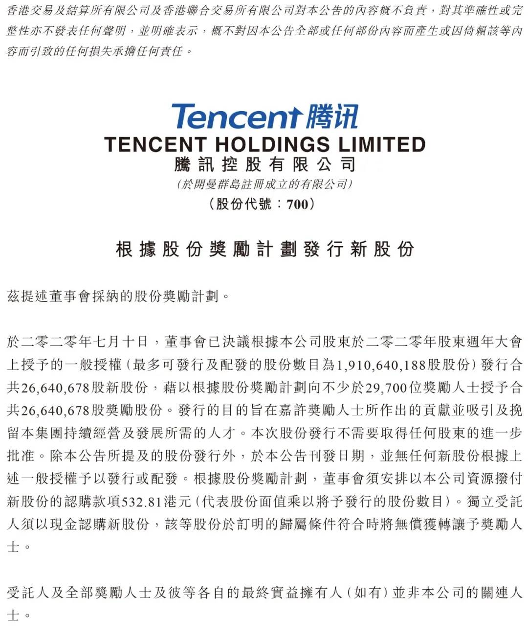 7月10日晚,腾讯在港交所发布最新的股权激励计划公告,宣布腾讯将根据股份奖励计划发行2664万股新股份,拟授予不少于29700位受奖励人士。