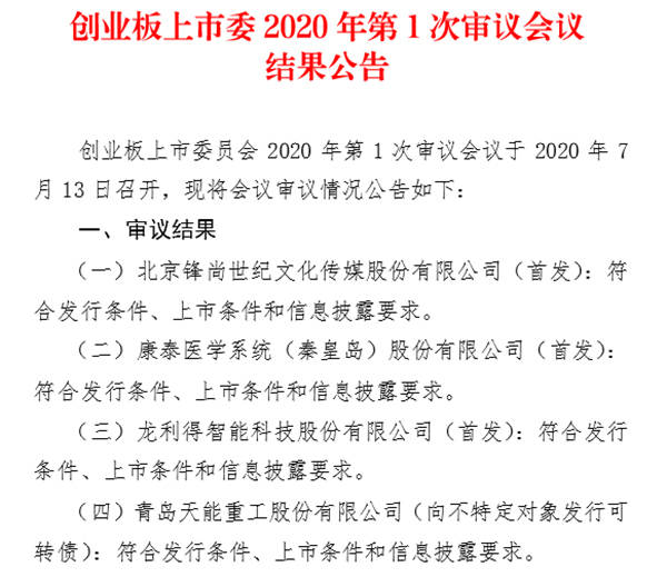 7月13日晚间,深圳证券交易所官网发布了创业板上市委2020年第1次审议会议结果公告,这场审议会议在当日召开,是创业板上市委自注册制改革之后开展的第一场审议会议。