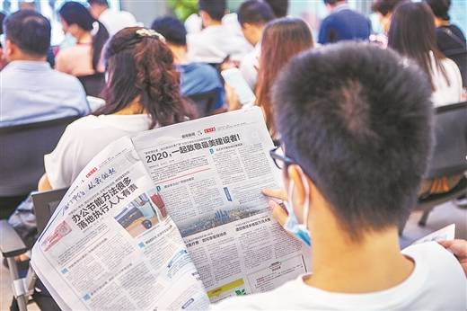 ▲参会企业代表在阅读“最美建设者”相关报道。