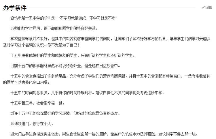 百度百科对应词条“办学条件”一栏介绍,“廊坊市第十五中学的校训是‘不学习就是违纪,不学习就是不孝’”、“十五中没有成绩好的学生和成绩差的学生,只有听话的学生和不听话的学生”、“建议自律性不强的同学优先考虑这所中学”。