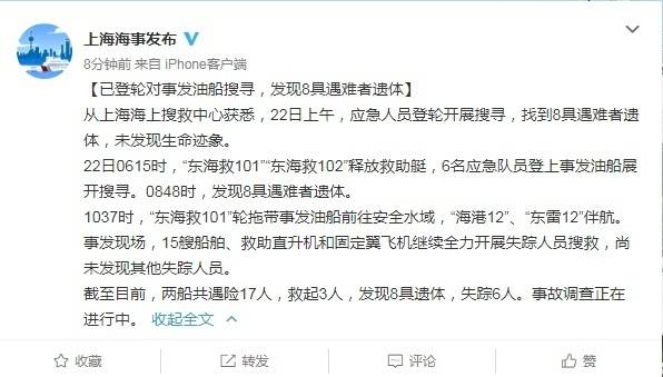 22日0615时,“东海救101”“东海救102”释放救助艇,6名应急队员登上事发油船展开搜寻。0848时,发现8具遇难者遗体。
