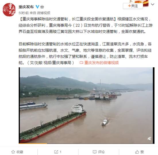 重庆海事局同日发布航行警告,于15时起解除长江上游界石盘至观音滩及嘉陵江黄花园大桥以下水域临时交通管制,全面恢复通航。