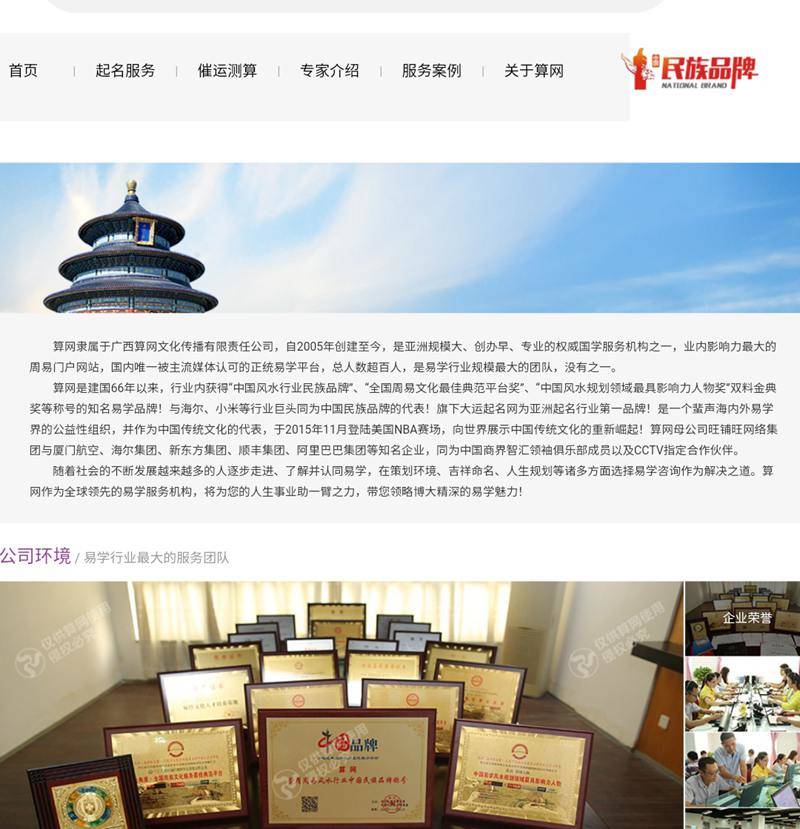 此外,“算网”还宣称有多项荣誉加身。除了被国务院特批为“中国民族品牌”外,还是NBA、CCTV的官方合作伙伴,获得了“中国起名行业领导品牌”“中国消费者最信赖的姓名学泰斗”“周易文化最具竞争力诚信平台”等称号,该公司的“大师”还多次被央视专访报道,被人民日报等权威媒体授予“中国国学文化影响力人物”。