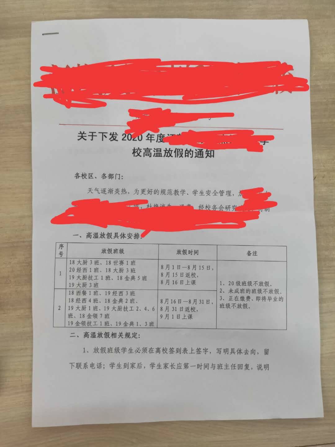 高时海向记者出示了一份学校的《高温放假通知》,上面显示,小黄所在的班级(18经西4班)在8月16日至31日属于放假时间。高校长说:“这份放假文件都是提前上报过主管部门,备过案的。”