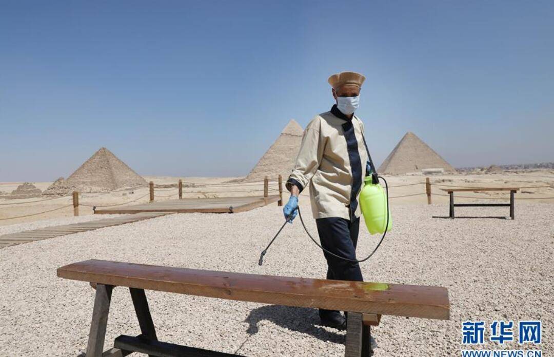 一名工作人员在埃及吉萨金字塔附近喷洒消毒剂。新华社发(艾哈迈德·戈马摄)