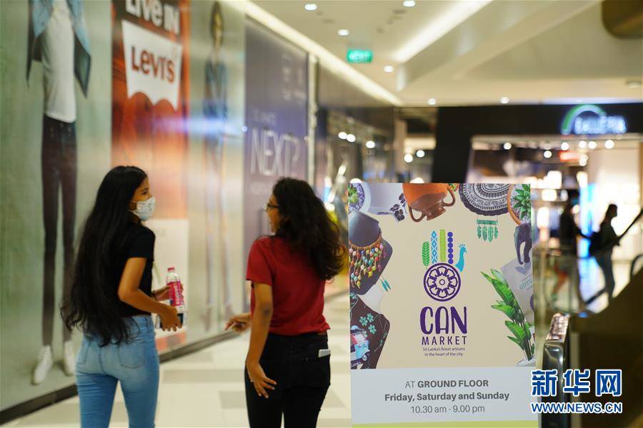 在斯里兰卡首都科伦坡,两名女子走过“锡兰工匠网络周末集市”的招贴画。新华社记者 唐璐 摄