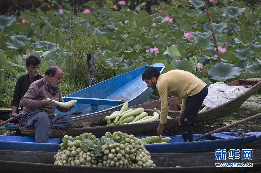 在印控克什米尔斯利那加,人们来到水上蔬菜市场交易。 新华社发(贾维德·达尔摄)