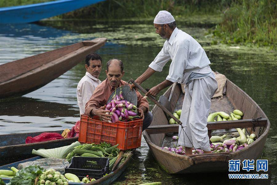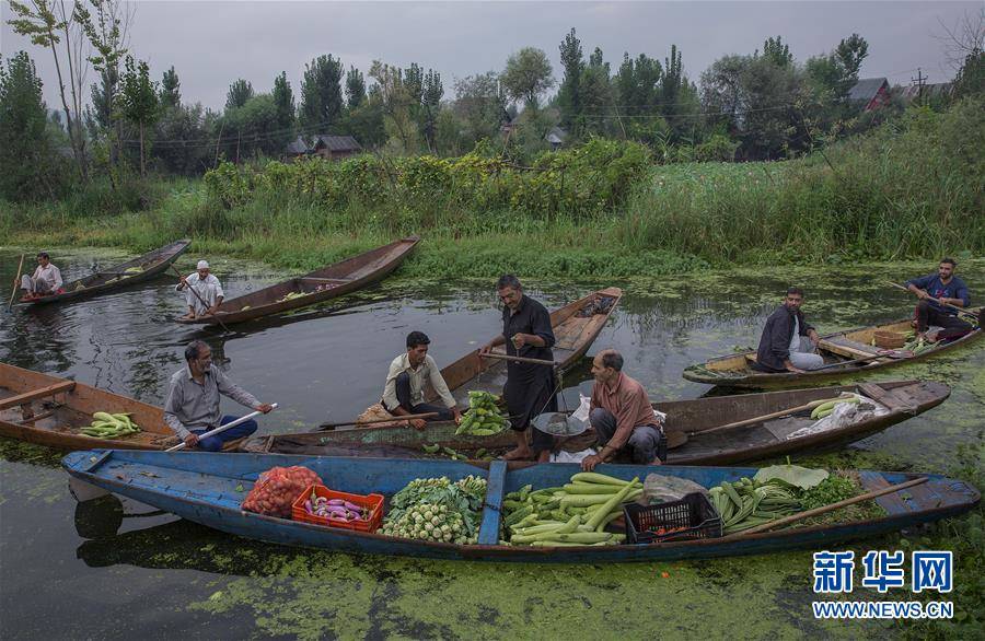 人们在印控克什米尔斯利那加的水上蔬菜市场交易。 新华社发(贾维德·达尔摄)