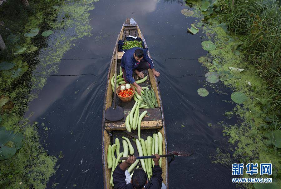 在印控克什米尔斯利那加,商贩划船前往水上蔬菜市场交易。 新华社发(贾维德·达尔摄)