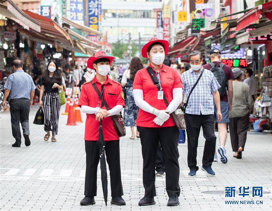 在南大门市场,旅游咨询员戴着口罩执勤。新华社发(李相浩摄)