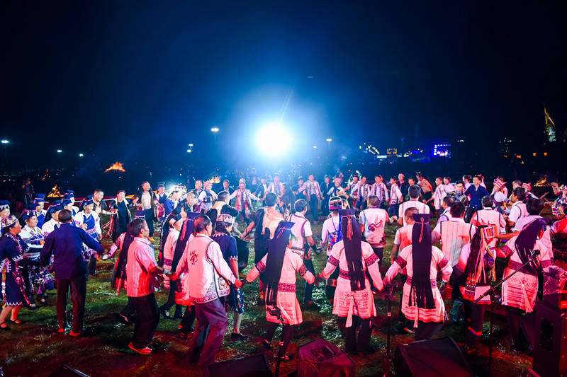 夜幕降临,伴随着激情四射的音乐,少数民族同胞们换上传统民族服饰,迎接前来参与盛会的每一位游客,游客们跟随演艺队伍的引领,汇聚在摩天轮下,孔雀花坛四周。火把熊熊燃烧,火光映衬着游客们的笑脸,激情满满的云南少数民族舞、节奏明快的印度舞、浪漫唯美的日本舞,以及热烈奔放的法国舞轮番上演舞蹈教学,国际化与民族化的融合汇聚成了闪耀的篝火狂欢。在五彩斑斓的烟花烘托下,狂欢气氛达到最高点,人们手拉手围成圆圈载歌载舞,共聚这一美好时刻……