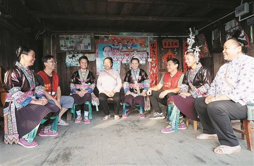 柳州银行派驻贫困村“第一书记”蔡政言(右三)与广西柳州市融水苗族自治县木业村的村民促膝谈心。 何虹甫摄
