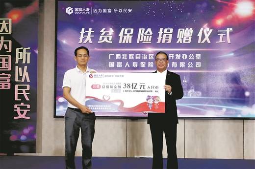 国富人寿连续三年向广西全区5300余名驻村第一书记赠送意外伤害保险,总保险金额38亿元。