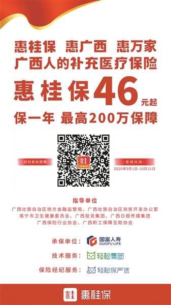 据储良介绍,作为惠民保险民生工程,“惠桂保”具备覆盖人群广、参保门槛低、保费亲民实惠、保障额度较高、引入公益筹款、无等待期等众多优势,充分体现了保险普惠和回归保障的特质,致力于解决广西人民的高额住院支出困难。首先,“惠桂保”以普惠民生为出发点,面向广西各地市基本医保有效参保人员(包括职工和居民),出生28天至100岁老人均可参保,让难以被一般商业健康险承保的人群增添了基本医保外的一重保障。其次,“惠桂保”不但保障医保范围内的个人自付部分,还创造性地将11种广西高发疾病的医保范围外个人自费的住院支出纳入保障范围,两项保障责任保额双百万,赔付比例高达80%。最后,“惠桂保”引入轻松筹的公益众筹机制,对于贫困出险人员,可由轻松筹开通绿色通道筹集善款,继续弥补医疗资金缺口,在创新探索“基本医保+补充医疗+公益众筹”体系构建的道路上率先起跑。