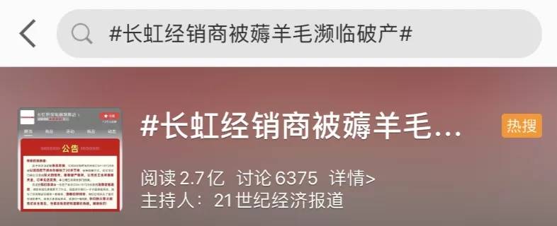 10月11日,一则长虹电器经销商被“薅羊毛”濒临破产的消息登上微博热搜。