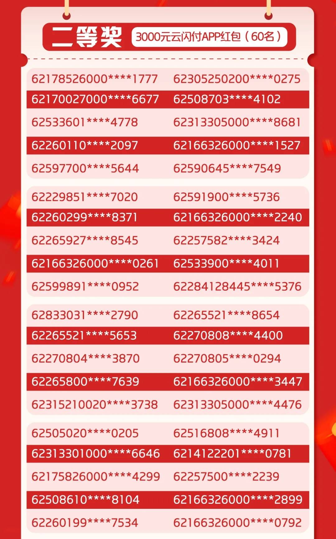 二等奖为价值3000元的云闪付APP红包,共300名;