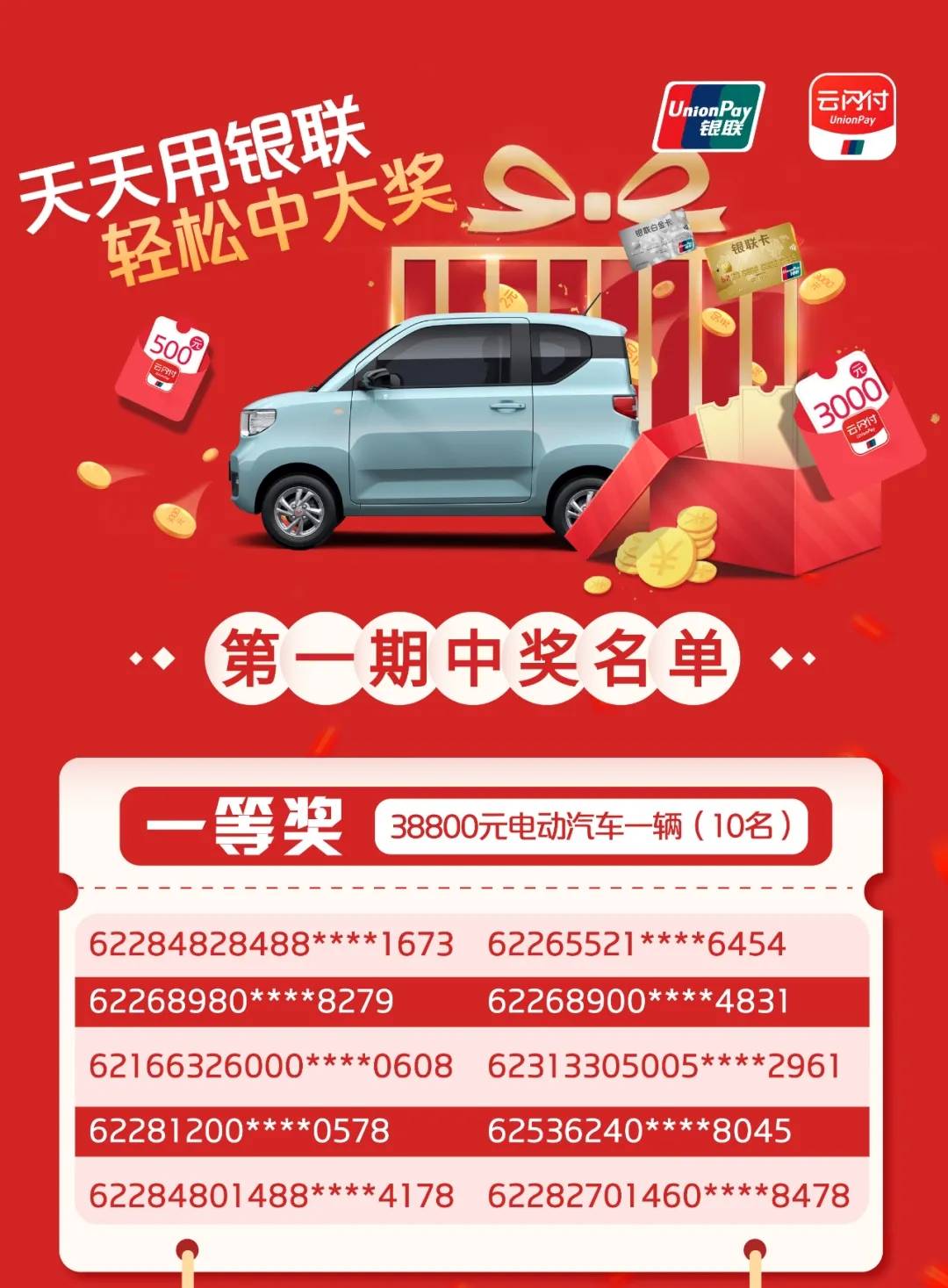 本次开奖为该活动第1期开奖,共抽出一等奖价值38800元汽车10名、二等奖3000元云闪付红包60名、三等奖500元云闪付红包400名。