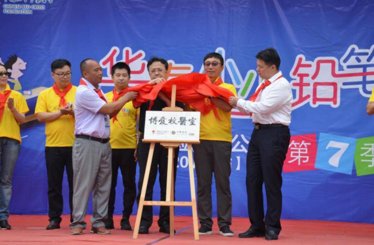 华泰保险集团董事长兼首席执行官王梓木、中国红十字基金会理事长郭长江、良庆区区长王川,以及那团小学校长林培祯,一起为“华泰保险博爱校医室”揭牌。