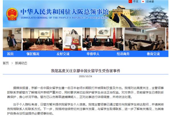 中国驻大阪总领事馆网站10月24日消息,据媒体报道,京都一名中国女留学生遭一名日本老师长期殴打并被限制饮食及外出。驻大阪总领馆对此高度关注,主管领事即联系京都警方了解情况并表明严重关切,同时要求其切实保护留学生合法正当权益。对方表示,目前留学生已得到妥善保护,身心状况平稳。警方已以伤害罪逮捕嫌疑人,正对此事进行详细调查,并将依法处理。