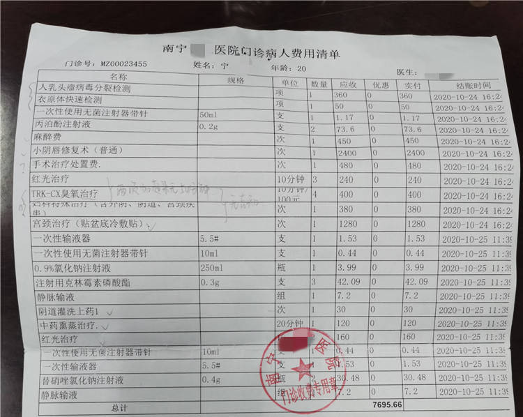 然而,做完手术后,她看到费用清单时傻了眼,手术费用加上治疗、麻醉费用一共需要6000多元,单是小阴唇修复术就要2400元,加上前面的检查治疗费用,小宁总共花费了近7700元的治疗费用。