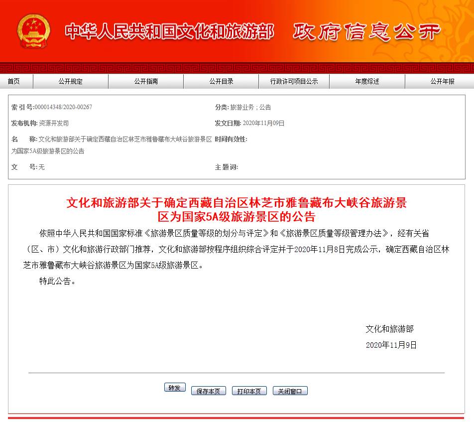 11月9日,文化和旅游部发布公告,确定西藏自治区林芝市雅鲁藏布大峡谷旅游景区为国家5A级旅游景区。