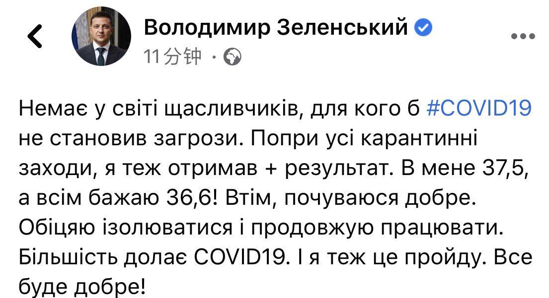 另据乌克兰国家通讯社报道,乌克兰总统泽连斯基当天在其社交账户上宣布其新冠病毒检测结果为阳性。他在其社交账户上称自己目前体温37.5度,感觉良好,将进行自我隔离并将继续工作。泽连斯基写道:“我目前体温37.5,我感觉很好,我将保证进行自我隔离并继续工作。”