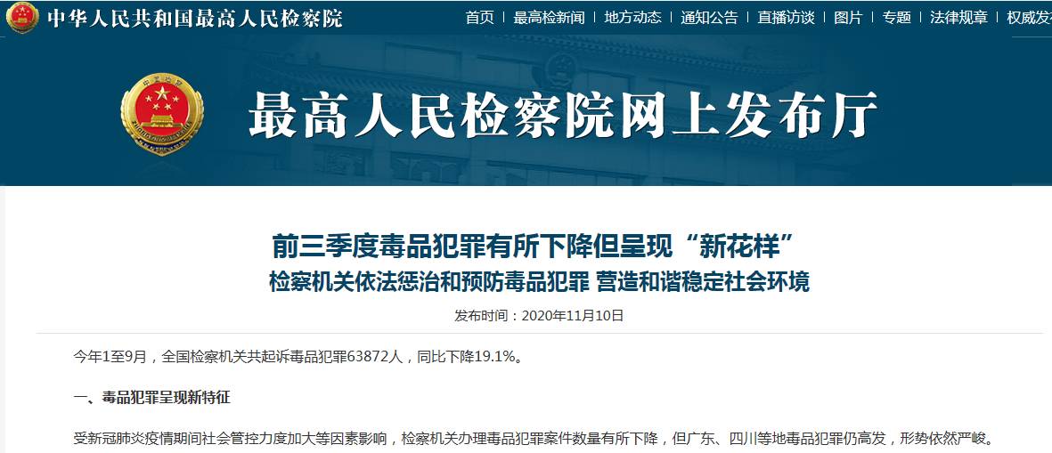 最高人民检察院指出,受新冠肺炎疫情期间社会管控力度加大等因素影响,检察机关办理毒品犯罪案件数量有所下降,但广东、四川等地毒品犯罪仍高发,形势依然严峻。