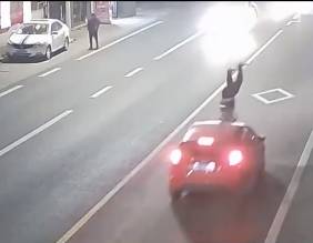 但并不是每一辆车都能及时避让。20秒后,一辆红色轿车驶来,刘某被撞飞,空中旋转1周后,摔倒在地上。