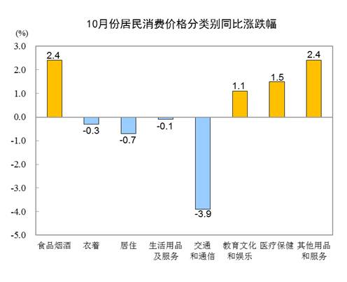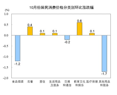 10月份,全国居民消费价格环比下降0.3%。其中,城市下降0.3%,农村下降0.5%;食品价格下降1.8%,非食品价格上涨0.1%;消费品价格下降0.6%,服务价格上涨0.1%。