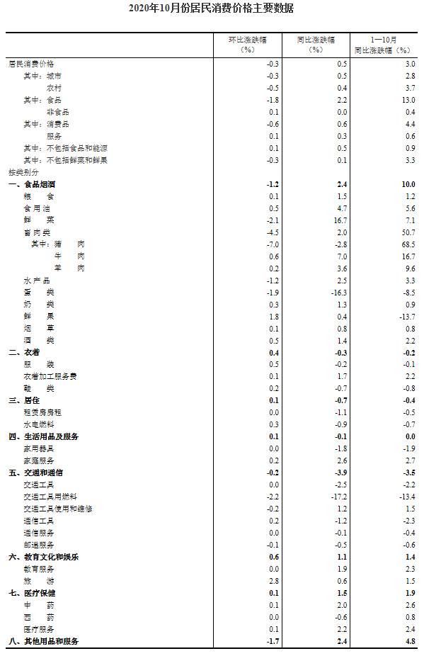2020年10月份,全国居民消费价格同比上涨0.5%。其中,城市上涨0.5%,农村上涨0.4%;食品价格上涨2.2%,非食品价格持平;消费品价格上涨0.6%,服务价格上涨0.3%。1-10月,全国居民消费价格比去年同期上涨3.0%。