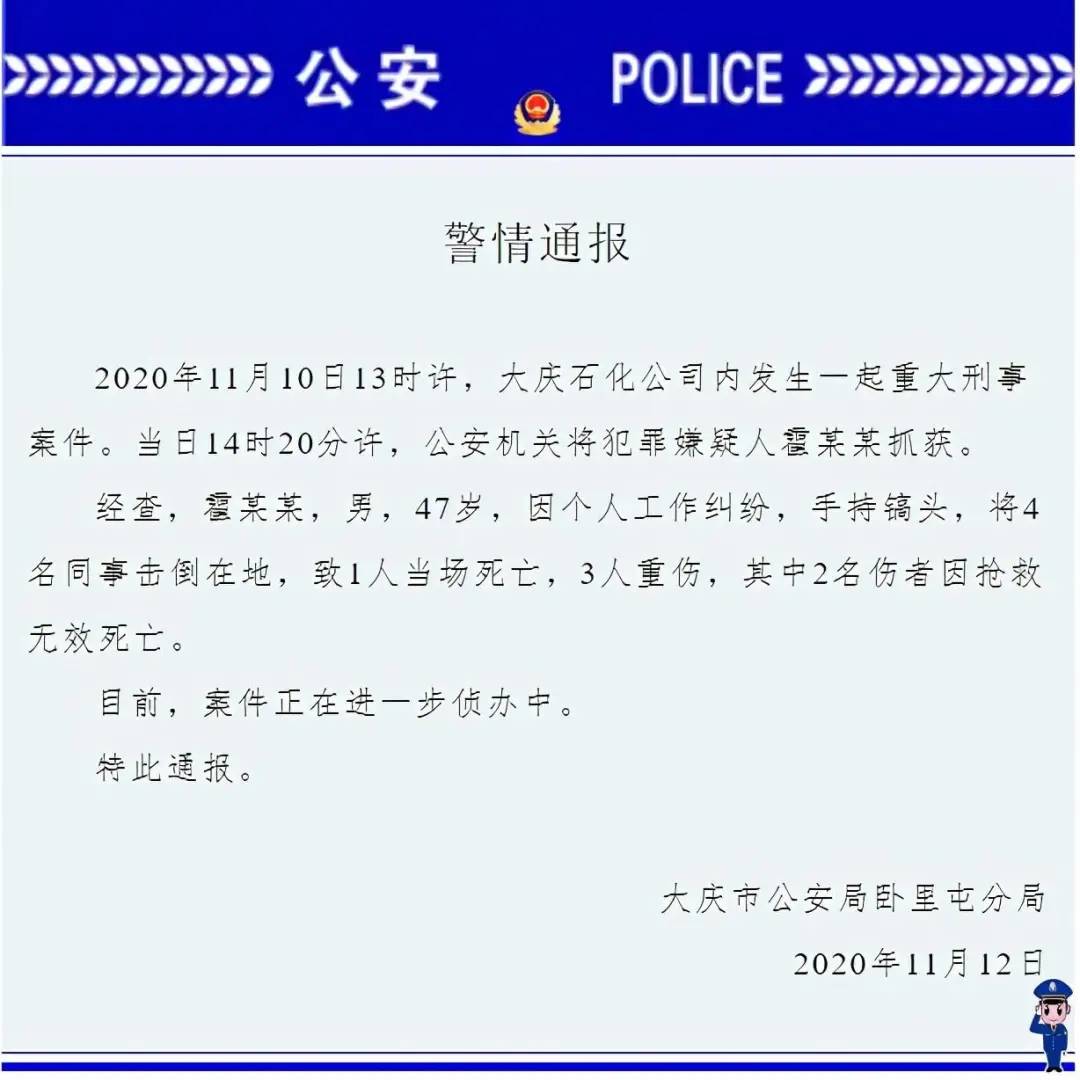 2020年11月10日13时许,黑龙江大庆石化公司内发生一起重大刑事案件。当日14时20分许,公安机关将犯罪嫌疑人霍某某抓获。