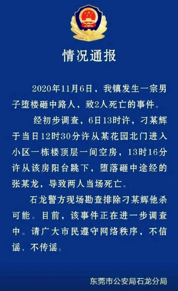 11月6日,东莞市公安局石龙分局发布情况通报称,当天石龙镇发生一宗男子堕楼砸中路人,致2人死亡的事件。