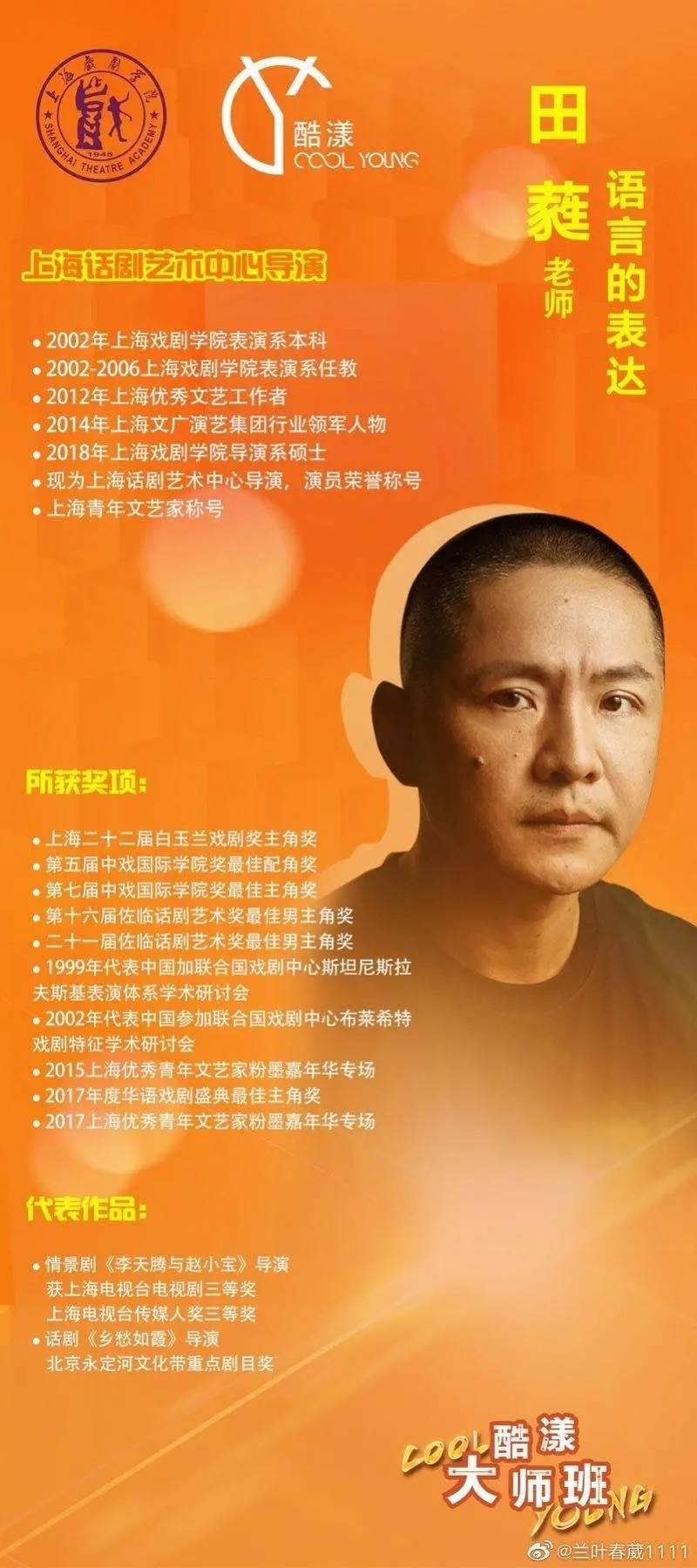 公开资料显示,田蕤,国家一级演员,现任上海话剧艺术中心导演、演员,曾在上海戏剧学院表演系任教,曾任上师大客座教授。荣获上海青年文艺家称号、上海优秀文艺工作者、上海文广演艺集团行业领军人物、上海二十二届白玉兰戏剧奖主角奖、第七届中戏国际学院奖最佳主角奖、二十一届佐临话剧艺术奖最佳男主角奖等。