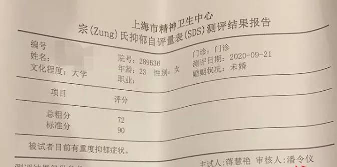 杨青也透露,该案当事女生情绪极度不稳,出现严重抑郁症状。据受害女生出具的两份上海市精神卫生中心的宗氏抑郁及焦虑自评量表报告显示,其处于重度焦虑和重度抑郁症状。