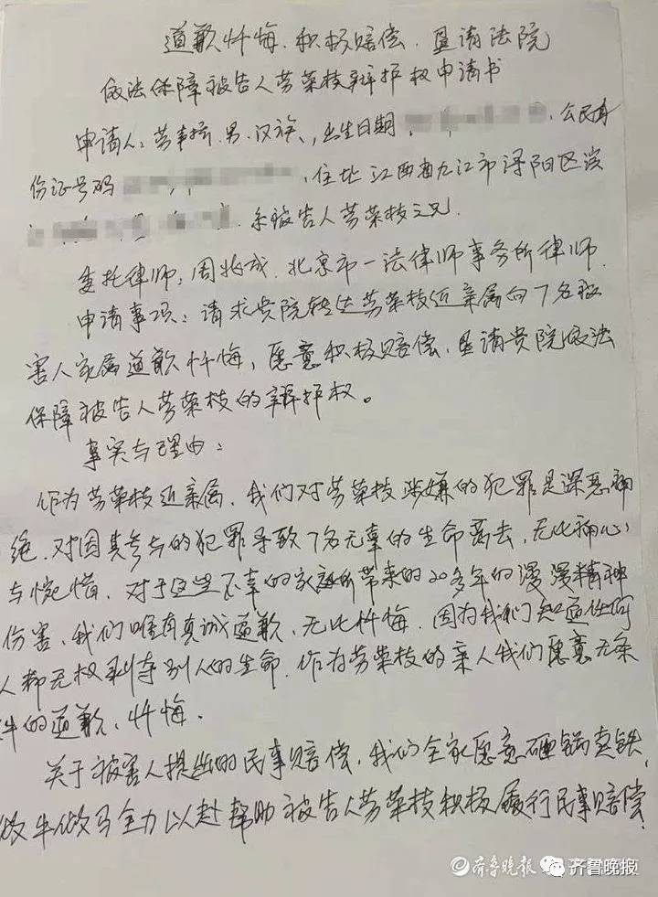 这封申请书里,劳声桥表达了向7名被害人道歉忏悔,愿意积极赔偿的想法,并表示希望南昌市中级人民法院依法保障劳荣枝的合法权益,期待法院给劳荣枝一个公正的审理。