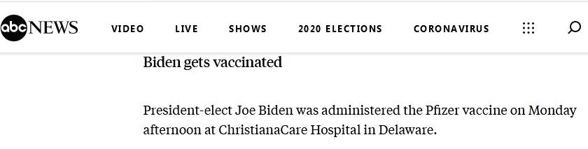 美国广播公司(ABC)消息,当地时间12月21日下午,美国当选总统拜登在位于特拉华州的克里斯蒂安娜医院(ChristianaCare Hospital)公开接种了辉瑞新冠疫苗。报道还说,拜登的夫人,吉尔·拜登博士周一早些时候已接种。