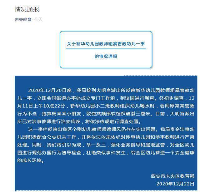 对此,西安市未央区教育局12月22日最新回应:2020年12月20日晚,我局接到大明宫派出所反映新华幼儿园教师粗暴管教幼儿一事,立即会同街道办事处成立专门工作组,到该园进行调查。经初步调查,12月11日上午10点22分,新华幼儿园小二班教师组织幼儿喝水时,老师厚某某管教行为不当,拖摔杨某某小朋友,致使其颏部软组织破裂三厘米。目前,大明宫派出所已对涉事教师进行治安传唤,将依法依规进行调查处置。