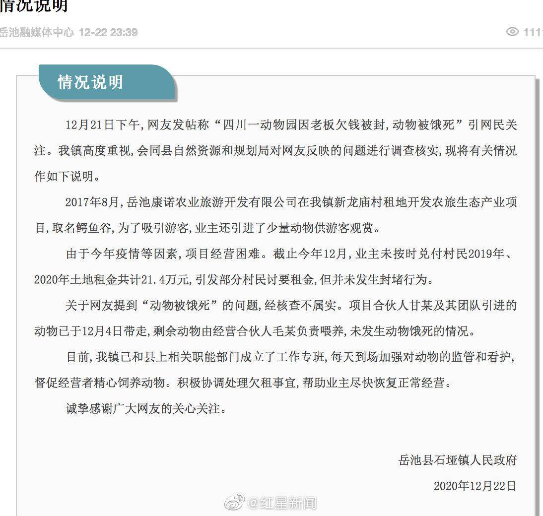 12月21日下午,网友发帖称“四川一动物园因老板欠钱被封,动物被饿死”引网民关注。石垭镇高度重视,会同县自然资源和规划局对网友反映的问题进行调查核实,现将有关情况作如下说明。