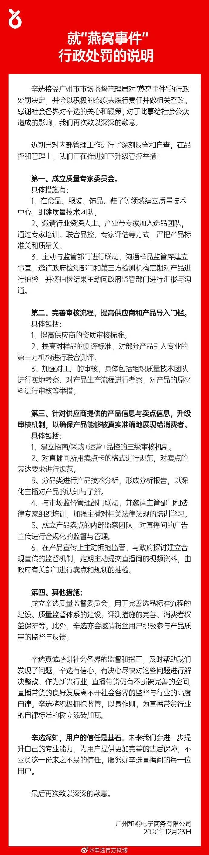 23日19时许,@辛选官方微博 发布了《就“燕窝事件”行政处罚的说明》(下文简称《说明》)。《说明》提到,广州和翊电子商务有限公司近期已对内部管理工作进行了深刻反省和自查,在品控和管理上提出四方面升级管控措施,其中包括成立质量专家委员会、完善审核流程、升级产品与卖点信息审核机制、成立辛选质量监督委员会等具体举措。