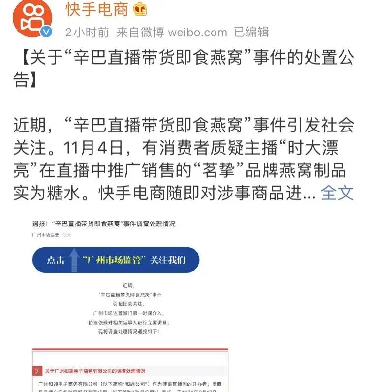 快手电商按照《快手小店商品推广管理规则》,全站下架该品牌燕窝产品,封禁“时大漂亮”账号电商功能14天;要求该主播所属广州和翊电子商务有限公司负责人辛有志妥善处理售后问题,积极配合相关部门调查,辛有志个人账号于11月17日起暂停直播。