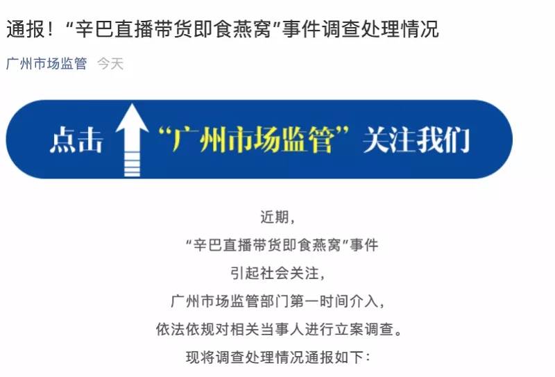 12月23日傍晚,广州市市场监督管理局通报“辛巴直播带货即食燕窝”事件调查处理情况。