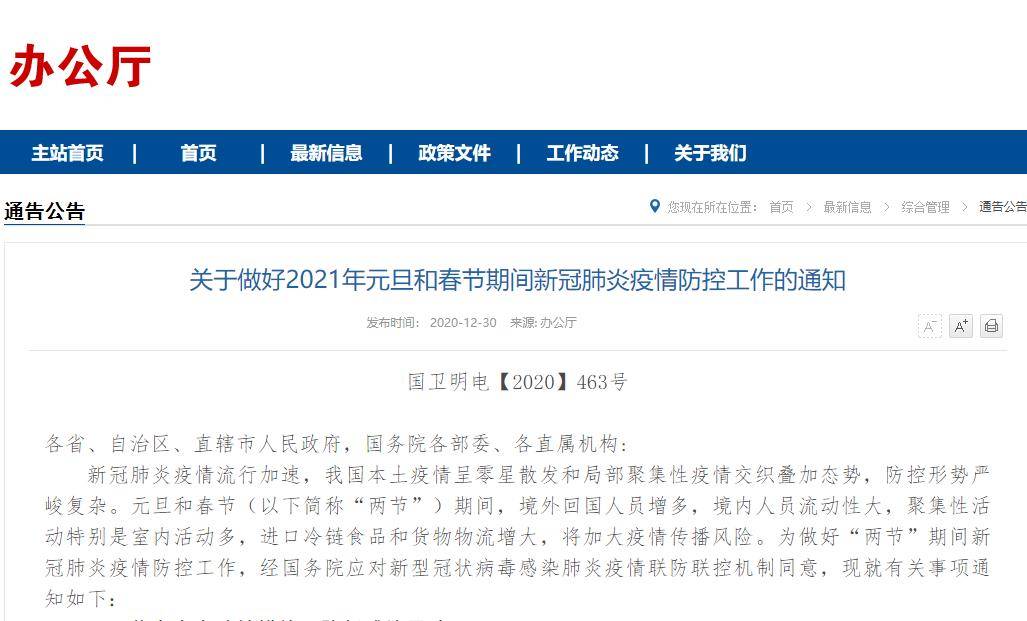 关于做好2021年元旦和春节期间新冠肺炎疫情防控工作的通知